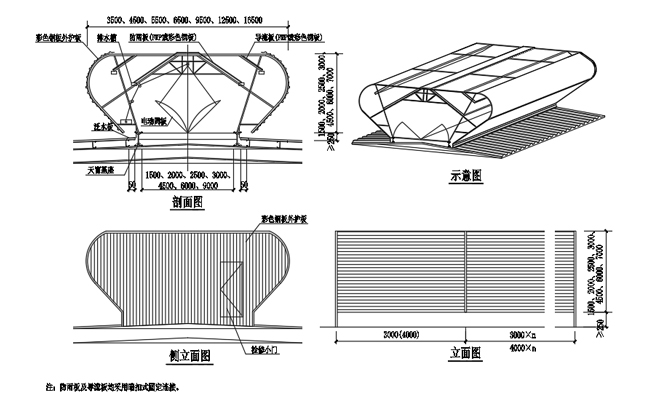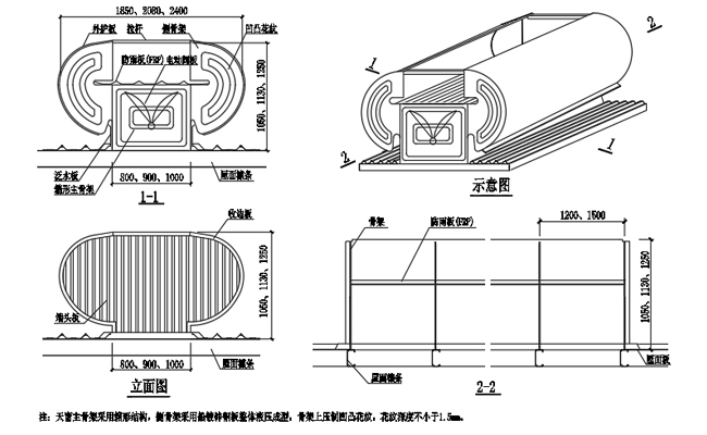 3. 通風(fēng)天窗側(cè)面外護板為彩鋼壓型板,泛水包邊板用彩鋼板折彎而成。